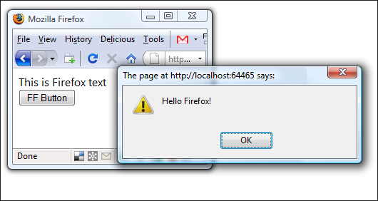 Notice the "ie:" and "mozilla:" prefixes on the Text and OnClientClick properties. The results? Take a look. The following was the result in Firefox: