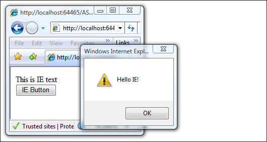 John Katsiotis' Web Dev & Stuff. The fact that I've written code so many times to accomplish this, when it's apparently been built in since version 2.0 just kills me. The properties of server controls will let you specify a browser filter to apply the property value for. That is, you can set a different value for a property for IE than for Firefox - and for anything else. I didn't try all properties, but I did try many that would matter, such as Text and OnClientClick etc, and they do work. Take a look at the following markup: